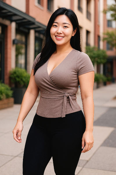 - 원피스, 블라우스, 티셔츠: 상체 볼륨이 강조되지만 허리가 뜨지 않도록 디자인