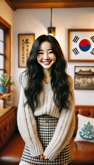 - 스타일: 부드러운 니트와 체크 패턴 스커트의 조합은 따뜻하고 귀여운 분위기를 연출해. 특히 가을이나 겨울철에 잘 어울리는 코디야.