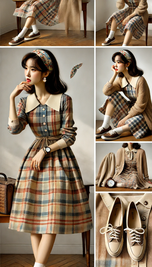- 액세서리: 머리띠나 스카프를 활용해 빈티지 스타일을 강조하세요. 작은 사이즈의 손목시계나 귀여운 귀걸이도 잘 어울립니다.