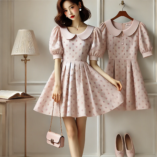 피터팬 칼라가 있는 A라인 원피스를 선택하세요. 파스텔 톤이나 부드러운 색상의 원피스는 더욱 여성스러운 분위기를 자아내며, 작은 플라워 패턴이 들어간 디자인은 빈티지한 매력을 더해줍니다.