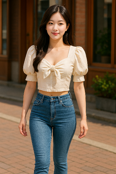 크림색 리본 타이 퍼프 블라우스와 중청 커브핏 진의 조합으로, 여성스러움과 캐주얼함을 동시에 살린 데이트룩입니다. 퍼프 소매와 리본 디테일이 상체에 볼륨감을 더해주고, 크롭 기장이 허리를 강조해 다리가 길어 보이는 효과를 줍니다. 하이웨이스트 커브핏 진은 허리는 슬림하게, 힙과 허벅지는 자연스럽게 감싸 곡선미를 부각시키며, 전반적으로 사랑스럽고 세련된 분위기를 연출했습니다. 이렇게 커브핏은 여성의 몸매를 돋보이도록 만들어주는 패션입니다.
