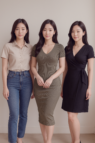 | 🔶 대상 체형 | 허리-엉덩이 곡선 강조, 체형 대비 상하체 밸런스 유지 | 가슴·엉덩이 강조, 실루엣 중심 | 곡선 체형을 슬림한 핏으로 연출 |
