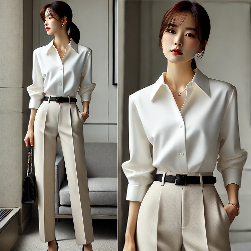 - 핏: 몸에 적당히 맞는 핏이 중요하며, 너무 타이트하거나 너무 헐렁하지 않은 스타일이 좋습니다. 클래식 블라우스는 바지 안에 넣어서 입는 경우가 많아 허리선이 강조됩니다.