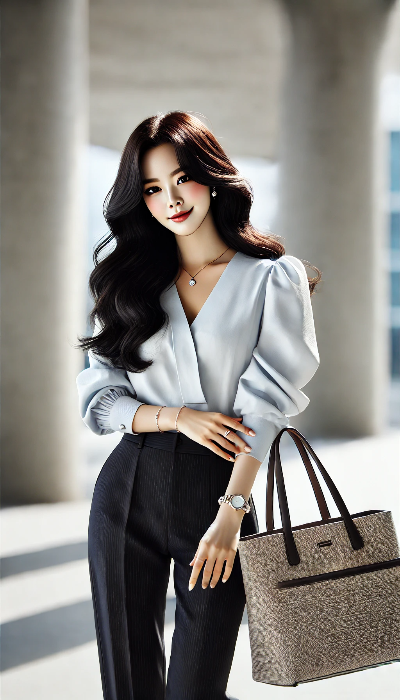 - 블라우스와 슬랙스: 세련되고 단정한 블라우스와 슬랙스를 매치하여 프로페셔널한 이미지를 연출했어.