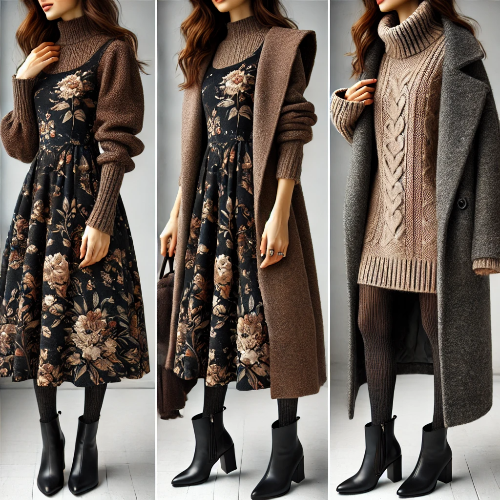 - 스타일링: 가을이나 겨울에는 어두운 색상의 플로럴 원피스를 선택하고, 롱 코트와 앵클 부츠로 따뜻하게 스타일링하세요. 레이어드할 수 있는 니트 스웨터를 원피스 위에 입어 포인트를 줄 수 있으며, 타이즈를 매치해 보온성을 높일 수 있습니다.