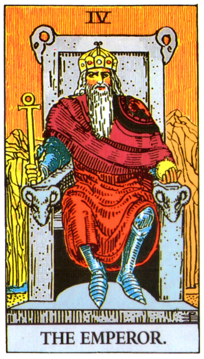 라이더-웨이트(Rider-Waite) 덱에서 황제는 붉은 로브를 걸친 채 돌로 된 견고한 왕좌에 앉아 있으며, 그의 왕좌에는 숫양의 머리가 새겨져 있습니다. 숫양은 전투적이고 리더십 강한 별자리인 양자리(Aries)의 상징으로, 강인함과 지도력, 행동력을 나타냅니다. 황제의 손에는 통치권의 상징인 홀과 구가 들려 있으며, 이는 세상을 다스릴 수 있는 물리적이고 상징적인 권력을 의미합니다.