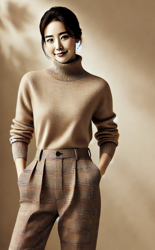 터틀넥과 체크 패턴 팬츠의 조합은 클래식하면서도 트렌디한 스타일을 연출해줍니다. 여기에 로퍼나 앵클 부츠로 마무리해 품격 있는 룩을 완성해 보세요.