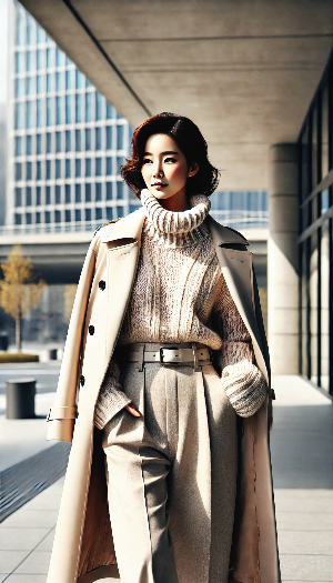 1. 베이지 또는 크림 컬러의 트렌치코트 + 파스텔 니트 + 와이드 팬츠