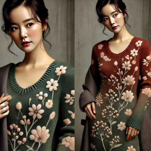 플라워 패턴이 들어간 니트 원피스는 포근하면서도 여성스러운 분위기를 한껏 살릴 수 있어요. 다만, 너무 화려하거나 큰 패턴보다는 은은하고 작은 플라워 패턴이 들어간 디자인이 나이에 맞는 고급스러움을 살려줍니다.