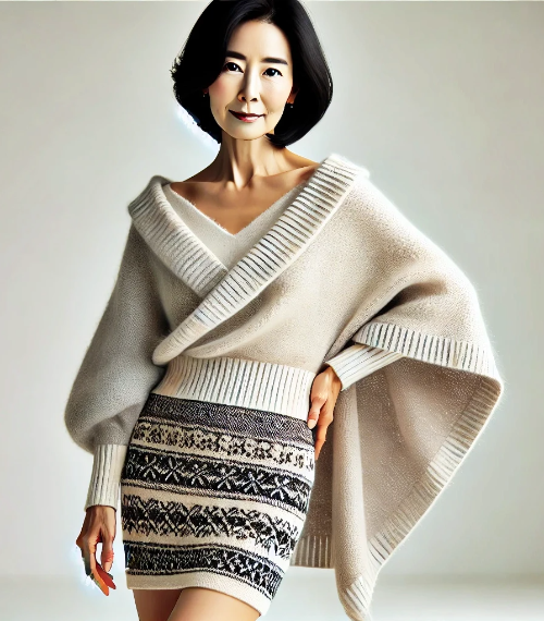이번에는 숄오프니트와 미니스커트를 매치해 봅니다. 니트 소재의 미니스커트를 기존 코디에 추가하면, 룩이 조금 더 캐주얼하고 경쾌한 느낌으로 바뀔 수 있습니다. 다음은 이 조합의 장점과 스타일링 팁입니다.