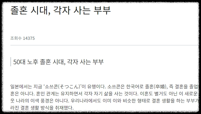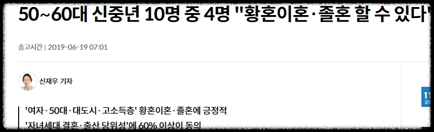 '졸혼'이란 키워드를 검색을 하니 생각지도 못한 통계를 발견했습니다. 황혼 이혼도 많이 하지만 의외로 서로 간섭하지 않는 졸혼을 선택하는 이들도 많다는 것입니다. 아래의 내용은 간략하게 정리한 것이지만 졸혼의 가장 큰 이유 중의 하나는 남성들의 무례함이 대부분이었습니다. 현재 60대 부부들은 자녀들이 최소 20대 중반에서 30대 중반까지 자란 성인들입니다. 이러다보니 여성들은 더 이상 자녀에 대한 의무도 없고, 그동안 참아왔던 남편의 무례함에 대한 도전? 반항에서 졸혼을 선택하고, 거부당하면 황혼이혼까지 불사한다고 합니다. 하여튼 오늘은 왜 여성들이 졸혼은 먼저 선택하는지를 정리해 봤습니다.