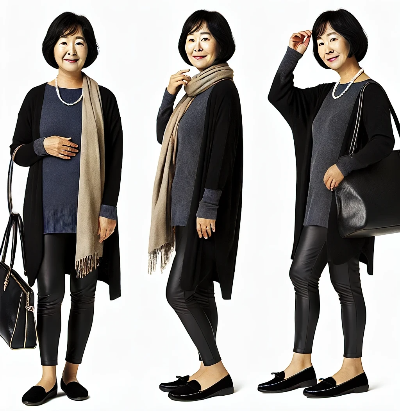 레깅스 스타일링에 고급스러운 스카프, 진주 목걸이, 또는 세련된 핸드백을 더하면 전체적인 룩에 우아함을 더할 수 있습니다. 또한, 편안한 로퍼나 부츠를 매치하여 스타일리시하면서도 실용적인 데일리 룩을 완성할 수 있습니다.