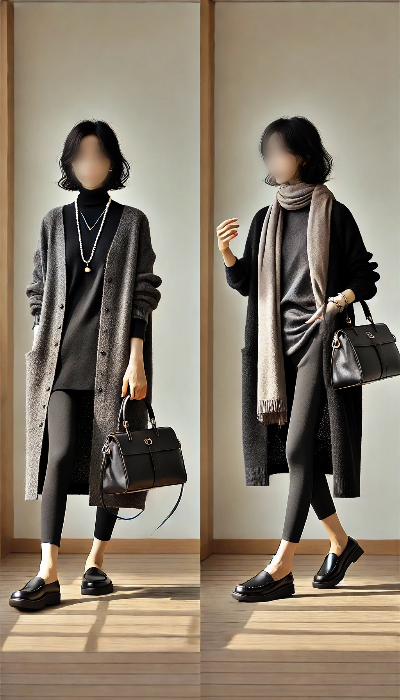 - 롱탑과 레이어링: 레깅스를 입을 때는 엉덩이를 덮는 길이의 롱탑이나 튜닉을 매치하면 전체적으로 균형 잡힌 실루엣을 만들 수 있습니다. 롱 가디건, 롱 셔츠, 또는 니트 스웨터와 함께 입으면 세련된 느낌을 더할 수 있습니다.
